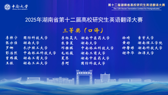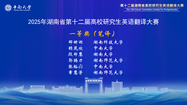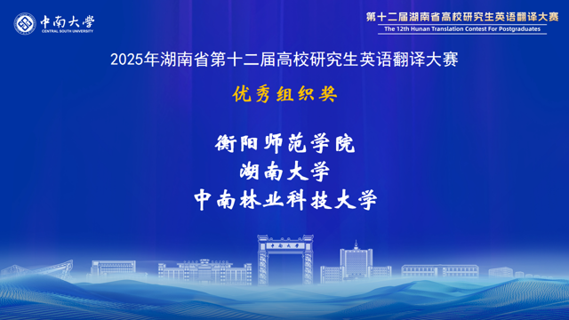 湖南省高校研究生英語翻譯大賽在省教育廳的有力指導(dǎo)和精心組織下,已成功舉辦了12屆。賽事對湖南省研究生翻譯與國際傳播能力的提升起到了巨大推動作用,賽事中涌現(xiàn)出的優(yōu)秀選手已經(jīng)活躍在外交外事、國際傳播、外貿(mào)交流、學(xué)術(shù)研究等領(lǐng)域。大賽為湖南省研究生搭建了高水平的競技與交流平臺,充分展示了我省研究生外語教育的豐碩成果,為服務(wù)湖南“三高四新”戰(zhàn)略、加強(qiáng)我國國際傳播能力建設(shè)發(fā)掘了大量青年翻譯人才。
