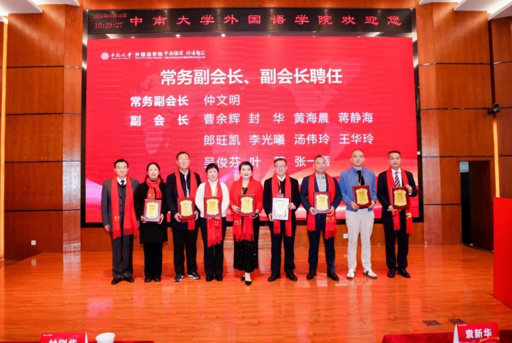 中南大學校友總會外國語學院分會監(jiān)事長楊文地為秘書長、常務副秘書長頒發(fā)聘書。
