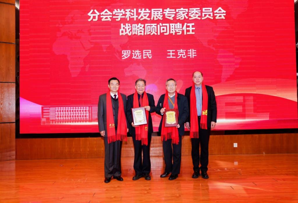 中南大學校友總會外國語學院分會會長李濤、監(jiān)事長楊文地為校友分會學科發(fā)展咨詢專委會顧問頒發(fā)聘書。
