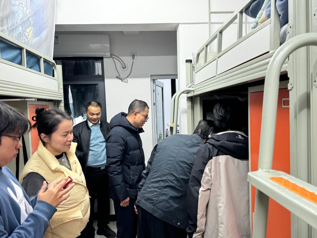 老師們走進(jìn)升華25棟二樓男生寢室與同學(xué)們親切交談,詢問(wèn)冬季保暖、學(xué)業(yè)進(jìn)展與日常生活情況。李濤鼓勵(lì)同學(xué)們從小事做起、從現(xiàn)在做起、從自身做起,積極而為、努力作為,以寢室為陣地,營(yíng)造勤學(xué)互助的優(yōu)良學(xué)風(fēng),將寢室建設(shè)成充滿書(shū)香、墨香的學(xué)習(xí)園地;學(xué)習(xí)之余將自己的生活安排得豐富多彩。仲文明重點(diǎn)關(guān)心寢室設(shè)施保障,了解大家是否有生活困難,并鼓勵(lì)大家發(fā)展興趣愛(ài)好,凝聚同窗情誼。侯合余著重強(qiáng)調(diào)安全紀(jì)律,叮囑同學(xué)們規(guī)范使用電器,保持環(huán)境衛(wèi)生,共同筑牢寢室安全防線。