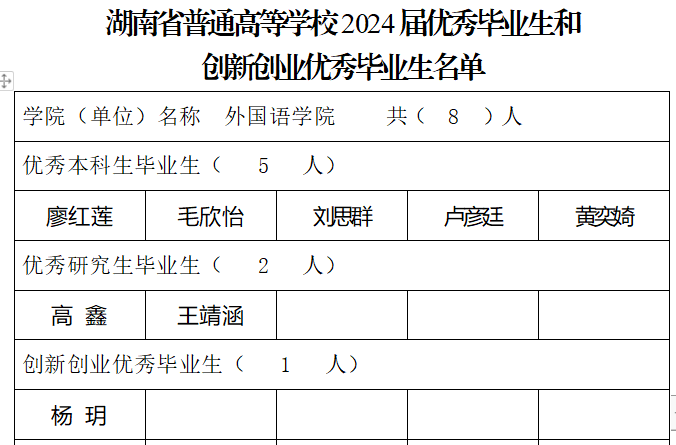 根據(jù)《關(guān)于推薦評(píng)選湖南省2024屆優(yōu)秀畢業(yè)生、創(chuàng)新創(chuàng)業(yè)優(yōu)秀畢業(yè)生和中南大學(xué)2024屆優(yōu)秀畢業(yè)生的通知》要求,經(jīng)過(guò)班級(jí)評(píng)議推薦,學(xué)院優(yōu)秀畢業(yè)生評(píng)選工作小組對(duì)班級(jí)提名推薦學(xué)生進(jìn)行資格審查并組織評(píng)選,確定了推薦名單,現(xiàn)將結(jié)果予以公示。
