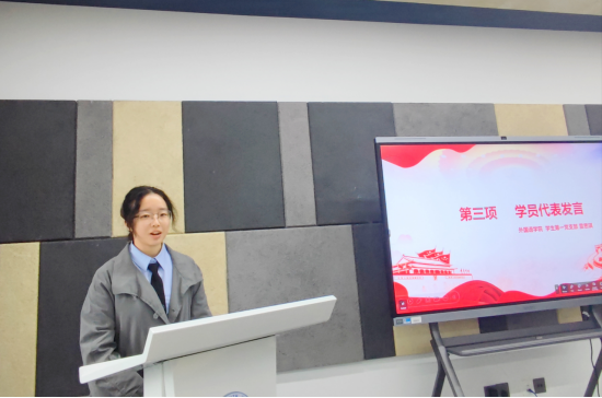 隨后,外國語學(xué)院雷思琪同學(xué)作為學(xué)員代表發(fā)言。她結(jié)合自身成長(zhǎng)經(jīng)歷,分享了從對(duì)黨的樸素感情到堅(jiān)定理想信念的思想歷程,表達(dá)了對(duì)黨組織的感激與向往。她引用習(xí)近平總書記對(duì)青年的殷切寄語,號(hào)召全體學(xué)員珍惜學(xué)習(xí)機(jī)會(huì),端正學(xué)習(xí)態(tài)度,嚴(yán)守培訓(xùn)紀(jì)律,努力將黨的理論知識(shí)內(nèi)化于心、外化于行,在學(xué)習(xí)、生活和未來工作中發(fā)揮先鋒模范作用,以實(shí)際行動(dòng)爭(zhēng)取早日加入黨組織,為實(shí)現(xiàn)中華民族偉大復(fù)興的中國夢(mèng)貢獻(xiàn)青春力量。