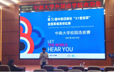 2025年4月19日上午,第30屆中國日報社“21世紀杯”全國英語演講比賽中南大學選拔賽于外國語學院報告廳舉行。比賽特邀方哲英、胡良驥、黃啟瑜、張春敏和周覺知老師擔任評委,2024年國賽亞軍獲獎選手劉軒彤擔任提問評委,往屆獲獎選手英語2021級本科生岳曉艷和口譯2024級研究生秦宇凱擔任主持人。