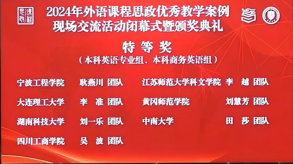 我院教師團(tuán)隊(duì)榮獲2024年外語(yǔ)課程思政優(yōu)秀教學(xué)案例現(xiàn)場(chǎng)交流活動(dòng)特等獎(jiǎng)